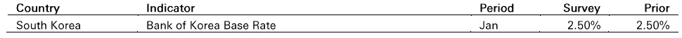 The Bank of Korea is expected to keep its policy rate at 2.50%, monitoring financial stability risks related to the housing market and FX volatility concerns.
