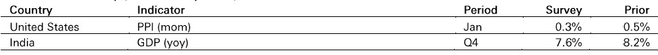 In the US, PPI is expected to have risen 0.3% mom in January compared to a 0.5% mom gain in December. The lagged impact of higher tariffs could lift final-demand core goods PPI, while services PPI has been volatile.