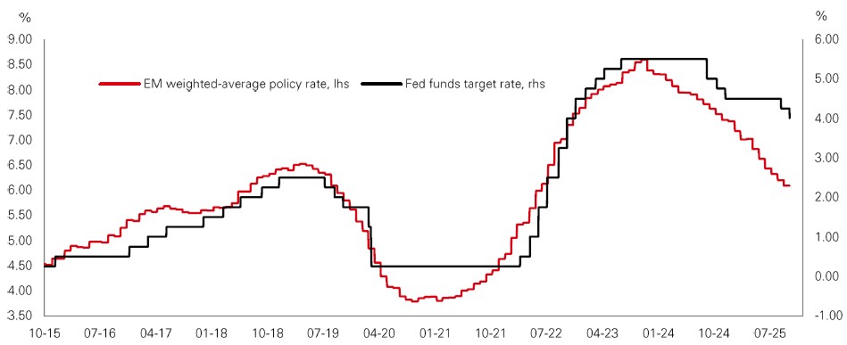 Meanwhile, emerging markets (EM) remain well positioned, supported by significant valuation discounts and Fed easing, which opens the door for further rate cuts by emerging central banks. Lower US rates can also contribute to downward pressure on the US dollar, a critical driver of EM returns in 2025 so far.