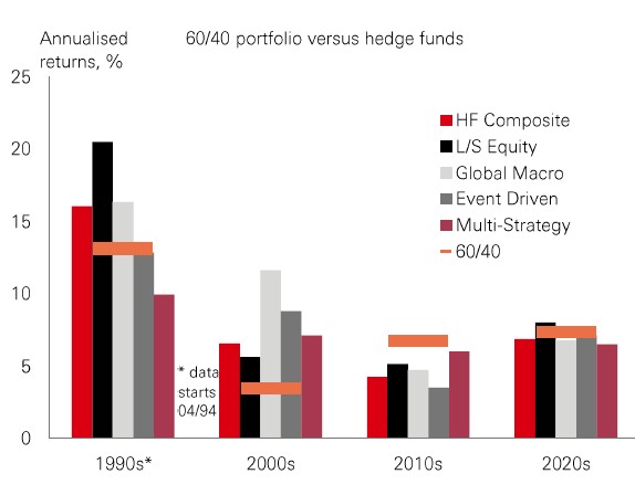 Step in hedge funds. Not only does this asset class offer attractive returns – holding up against the traditional 60/40 portfolio in the decade so far – but they have demonstrated lower correlations with stocks than US Treasuries. It is true that hedge funds didn’t perform as well in the 2010s, but that was a period of low macro volatility, little equity dispersion, and ultra-low interest rates, all of which created challenging conditions for hedge funds to perform. With the macro and market regime now looking more like the 1990s and 2000s, could we be entering a new golden period for the asset class?
