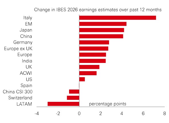 The good news for global investors in 2026 is that this process of re-rating has further room to run, with most PE ratios still well below historical averages, including those in the US. Profit expectations for ex-US markets in 2026 have also been upgraded. Perhaps these numbers have a better chance of sticking as trade tensions subside? Broadening out still looks good as a market theme for next year.