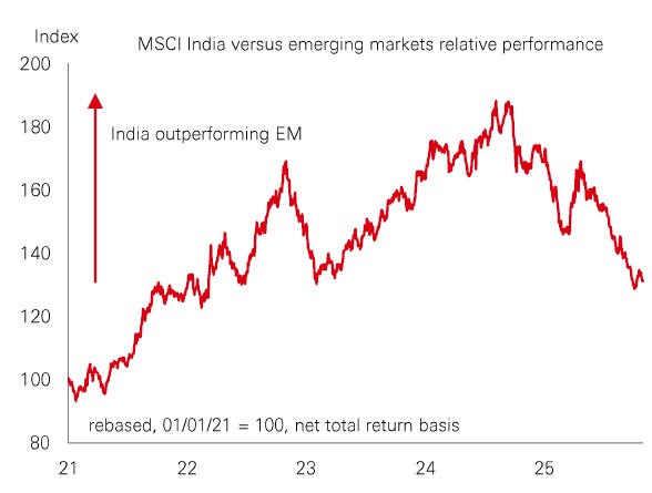 It’s been a relatively challenging year for India’s stock markets. The MSCI India index is up 4% (USD terms), versus a whopping 34% for the emerging markets index. But it’s important to remember a tough 2025 follows four years of huge gains. After such a long stretch of exceptional performance, a pause for breath isn’t too surprising. |