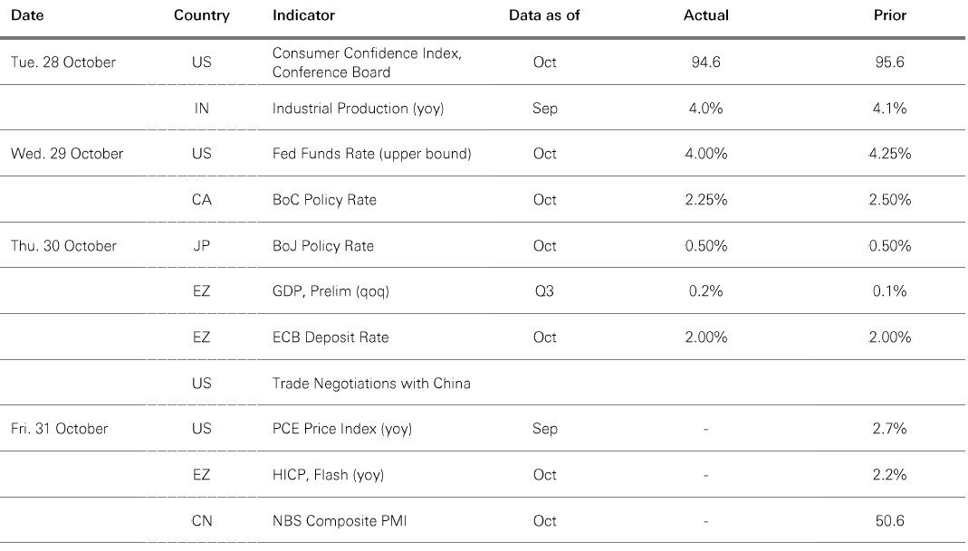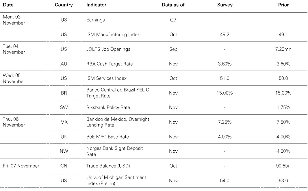 Source: HSBC Asset Management. Data as at 7.30am UK time 31 October 2025. For informational purposes only and should not be construed as a recommendation to invest in the specific country, product, strategy, sector or security. Any views expressed were held at the time of preparation and are subject to change without notice. Any forecast, projection or target where provided is indicative only and is not guaranteed in any way. *The ongoing government shutdown in the US may delay the expected releases of official data