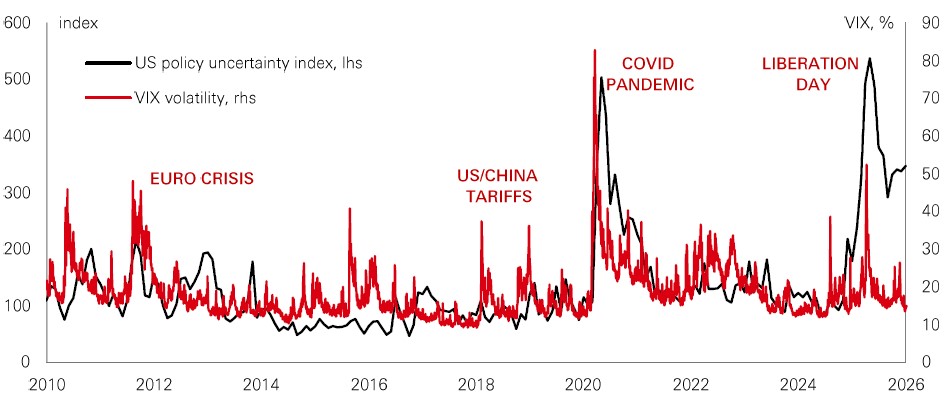 This contrast between elevated uncertainty and calm markets seems puzzling but makes sense in the context of a good global growth outlook, and an expected “coming together” of global profits growth in 2026. But as in 2025, geopolitical events will be a key influence on markets this year. This is important because, despite the bullish mood, a continuation of last year’s “bull market in almost everything” depends on good fundamental news being delivered. With some asset classes arguably “priced for perfection”, any adverse news could stoke volatility.