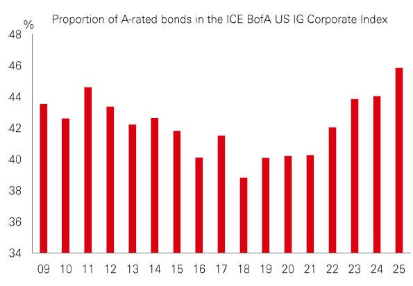 On top of this, an ongoing boom in debt issuance by tech hyperscalers seeking to fund the AI build-out (including mega-cap companies with strong credit ratings) is also boosting overall IG credit quality. While higher tech and AI exposure in the IG index could potentially overlap with similar tech exposure in equities, the overall IG asset class remains a compelling – and increasingly good quality – portfolio diversifier.