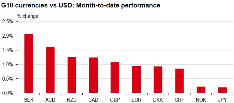 So far in December, the SEK has led G10 currency gains this month, followed by the AUD, NZD, and CAD (see the chart below). This trend reflects broad USD weakness across the G10 space (see FX Viewpoint Flash: USD: Fed’s third 25bp cut, with neutral guidance for details).