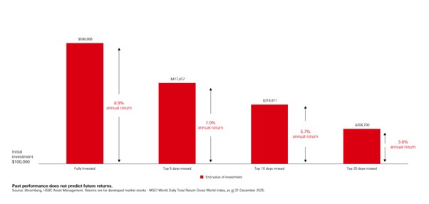 Source: Bloomberg, HSBC Asset Management, Investing = MSCI ACWI Net Return Index, 1 January 2004 to 31 December 2025. Past performance is no guarantee of future returns