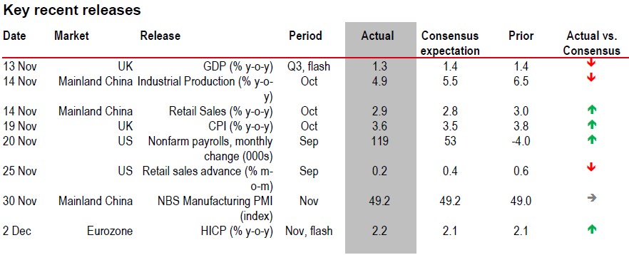 Despite very strong Q3 growth of 8.2% y-o-y in India, lower inflation provides scope for further easing. Fiscal and monetary stimulus also loom for China where the October data disappointed. Investment, consumption, and industrial production slowed, as external and domestic demand remained subdued. The property sector is also showing renewed weakness, with a steeper fall in primary home sales and real estate investments.