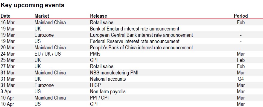 The conflict started at a time when the recent hard data had been quite solid. Global manufacturing and services PMIs (and particularly the US services ISM) increased in February even as the US labour market data continues to paint a mixed picture. January’s upside surprise in payrolls (+126k) was followed by a large drop in February (-92k) but jobless claims are low. Globally, inflation was little changed, although core inflation was up to 2.4% in the Eurozone in February and US core Personal Consumption Expenditures (PCE) was 3% in December.