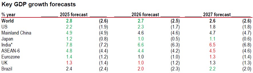 Note: *India data is calendar year forecast here for comparability. Previous forecasts are shown in parenthesis and are from the Macro Monthly dated 6 October 2025. Green indicates an upward revision, red indicates a downward revision.