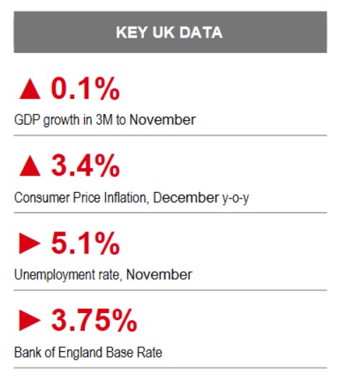 The year has started with mixed and volatile data, so it’s unclear how much underlying momentum in the economy has improved. Measures of business activity reported a sharp rebound in activity in January, most notably across services firms. However, consumer confidence ticked only 1pt higher, as improved confidence in personal finances was offset by lower expectations of the economy for this year. Those dynamics left consumers to continue to prefer saving. Elsewhere, there were signs that demand conditions are, at least, stabilising, house prices rose 0.3% m-o-m and manufacturers reported the fastest pace of new order growth since May 2022.