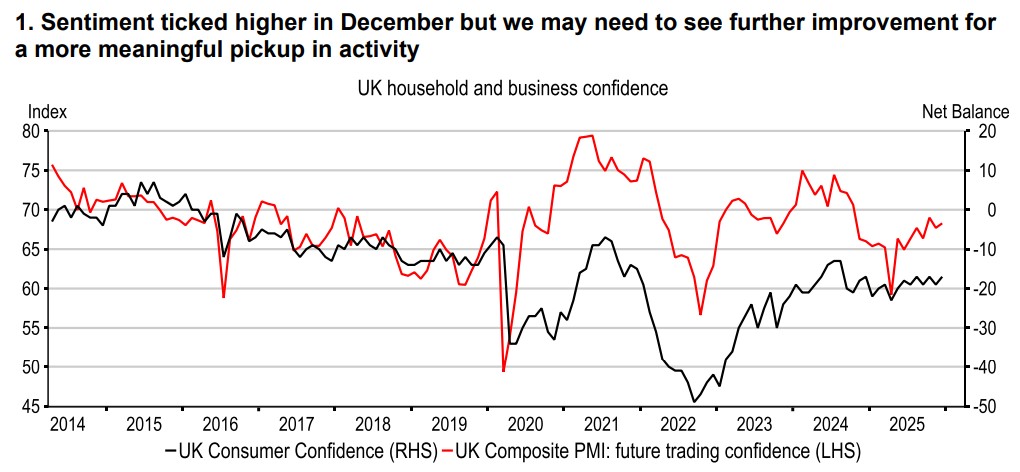The UK spent much of the second half of 2025 worrying about possible tax rises in the Budget. Now, with worst-case scenarios largely avoided, and the Autumn Budget in the rear-view mirror, hopes turn to an improvement in sentiment and a pickup in economic growth. Early indicators for December showed a mildly more positive environment, consumer confidence rose to -17, up two points from November, but it wasn’t enough to break out of its recent tight range. Similarly, the 0.6pt rise in the PMI business confidence in future trading expectations was modest given the degree of Budget-related uncertainty.